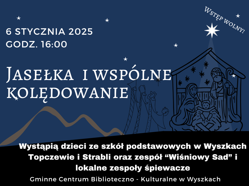 Zapraszamy wszystkich mieszkańców gminy Wyszki na jasełka przedstawiane przez dzieci ze szkół podstawowych z terenu Gminy Wyszki oraz na wspólne kolędowanie z lokalnymi zespołami : „Wiśniowy Sad”, KGW Klub Seniora „Razem” z Wyszek, KGW „Strabella – Moja Mała Ojczyzna” ze Strabli, KGW „Aktywna Wieś” z Niewina Borowego oraz Chór męski z Łubina Kościelnego. Zaczynamy 6 […]