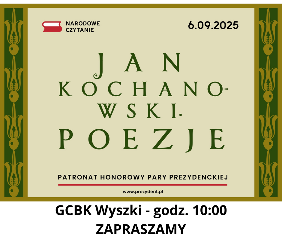 Zapraszamy w sobotę 6 września o godz.:10:00 do GCBK Wyszki na wspólne czytanie dzieł Jana Kochanowskiego.