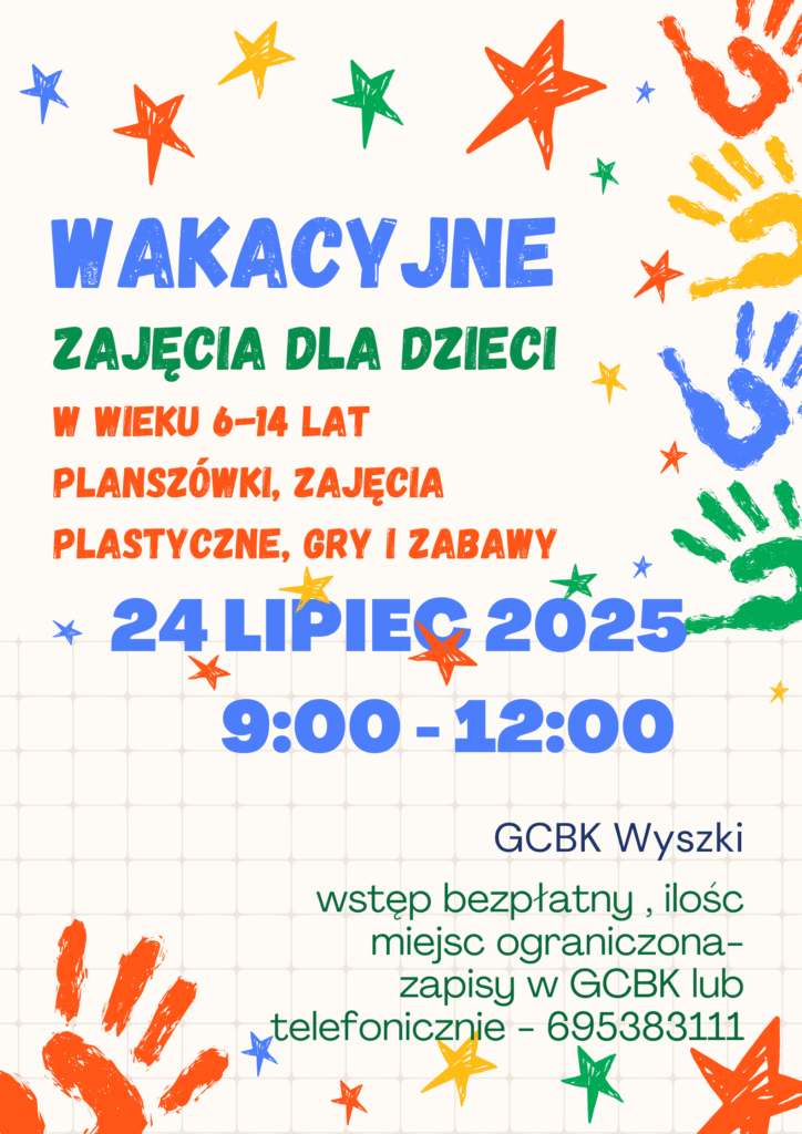 Zapraszamy w czwartek 24 lipca dzieci w wieku 7- 14 lat na wakacyjne warsztaty w bibliotece – wspólne zabawy, czytanie książek, zajęcia plastyczne, gry planszowe.