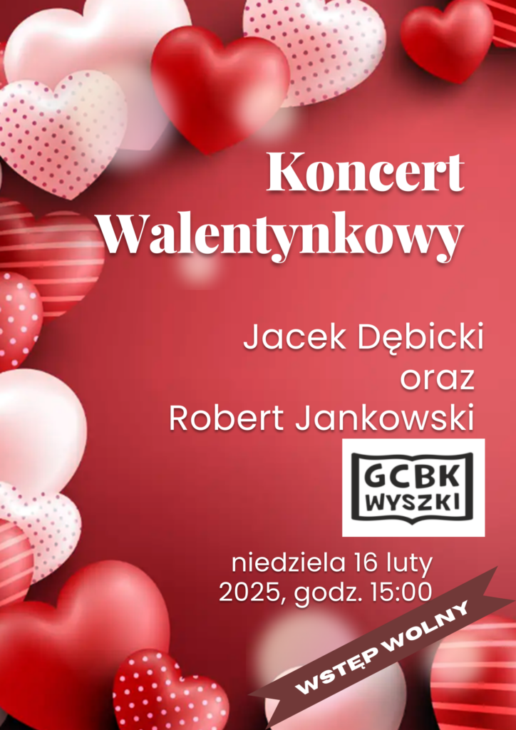 Już 16 lutego 2025 roku, z okazji Dnia Świętego Walentego czyli patrona zakochanych zapraszamy na koncert w wykonaniu Jacka Dębickiego oraz Roberta Jankowskiego. Muzyczna uczta dla serc gwarantowana- wstęp wolny!