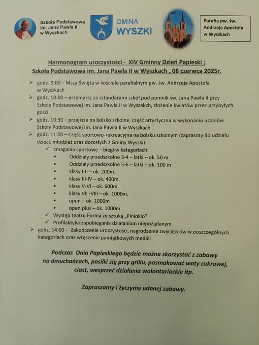 Wraz ze Szkołą Podstawową im. Jana Pawła II w Wyszkach zapraszamy na XVI Gminny Dzień Papieski.
